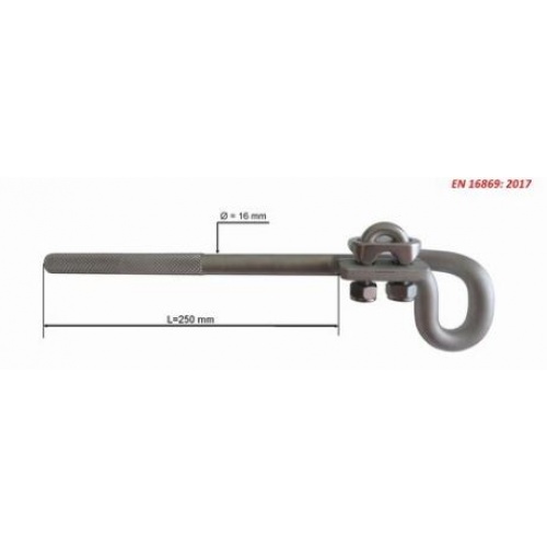 NEW ANCHOR FREQUENTLY USED WHEN CREATING “FRENCH”-STYLE VIA FERRATA ROUTES. NEW DESIGN EVEN MORE PERFORMING. This anchor is created in rounded and smooth stainless steel AISI 304 Ø16 mm rebar and has been shaped to allow horizontal or diagonal placements with a high level of safety during use. The “open" eye allows easy insertion of a safety rope - often used by Alpine Guides to further protect their clients. When the client reaches the anchor, the rope can be easily removed from the open eyebolt. The shank has a deep diamond-pattern knurl of 120 mm and must be sheathed in the hole for a length of minumum 160 mm The hole must be drilled using a Ø18 mm bit (such as art.449*). This anchor comes with a special stainless steel in-built clamp for excellent hold on the cable. The u-clamp nuts are self-locking, preventing accidental loosening of the cable. The surface of the anchor is finished in a slightly opaque grey for a reduced environmental and visual impact. Weight: 1000 gr